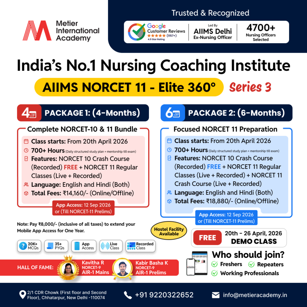 At Metier International Academy, we understand what it takes to turn that dream into reality. With a proven track record of guiding 4700+ nursing officers, our AIIMS NORCET 11 Elite 360ยฐ Program (Series 3) is designed to provide structured, exam-oriented preparation from start to finish.